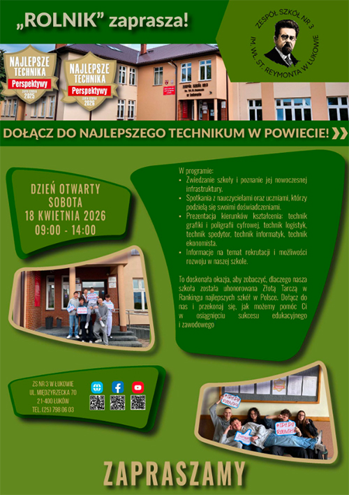„ROLNIK” zaprasza! Zespół Szkół Nr 3 im. Wł. St. Reymonta w Łukowie organizuje **DZIEŃ OTWARTY**!