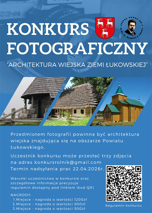 Konkursie Fotograficznym „ARCHITEKTURA WIEJSKA ZIEMI ŁUKOWSKIEJ”! Organizatorami konkursu są Zespół Szkół nr 3 im. Wł. St. Reymonta w Łukowie oraz Starostwo Powiatowe w Łukowie.